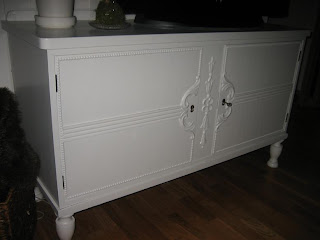Skjenken under har jeg kjøpt på finn.no, og den var rød-brun før den ble malt! Nå fungerer den som TV-bord!